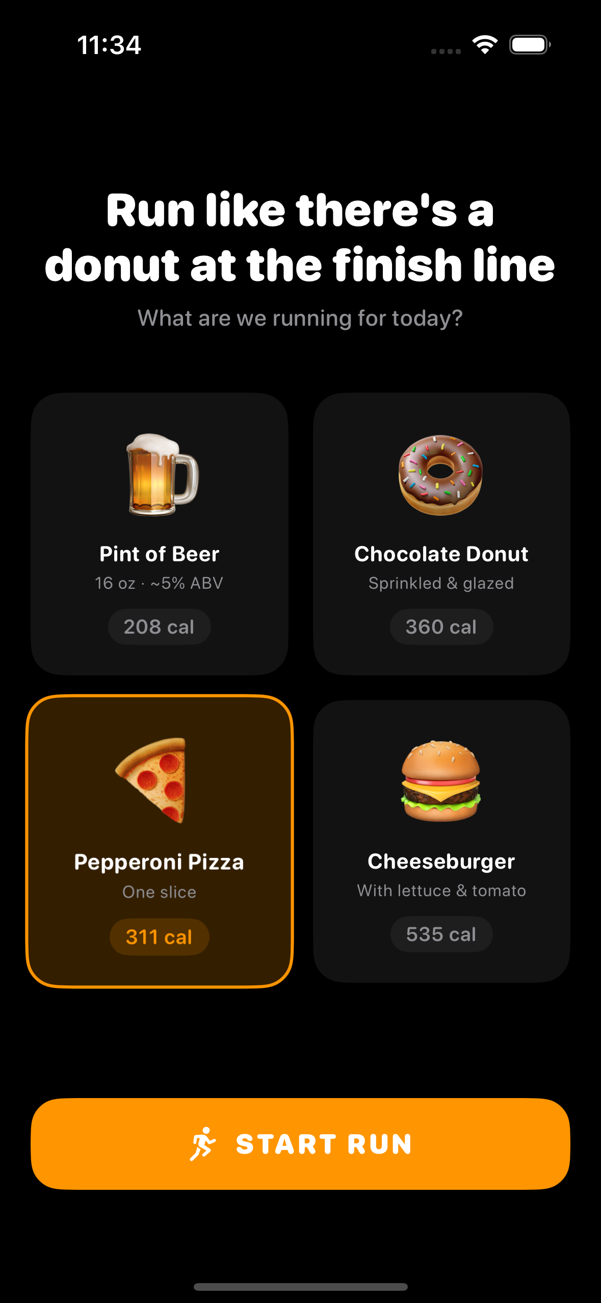 I originally liked how the item selection screen displayed additional metadata per item, e.g. Item name, number of calories, and a little bit of additional info. However, it felt intimidating to see all that information up front. From my past experience designing running apps, the more data shown, the quicker the experience skews towards non-casual runners, and that’s not what Rungry is about. I would rather have people debating the number of beers they earned on their run vs. calories burned.