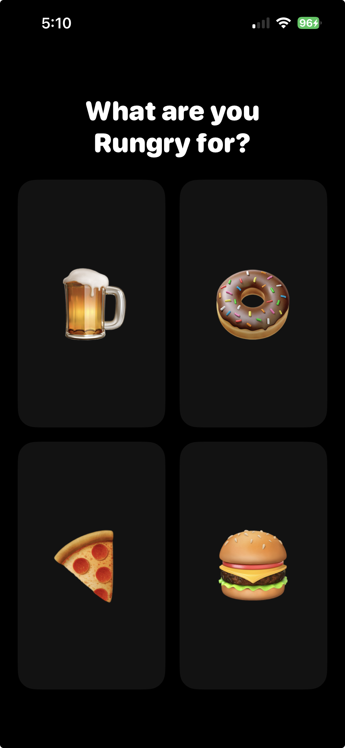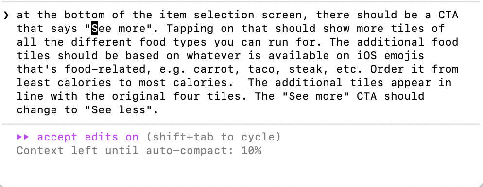 After simplifying the UI, it sparked new ideas and opened up new opportunities to add more variety/functionality to the screen. What if users can run for other types of food? Check out my prompt to the right.